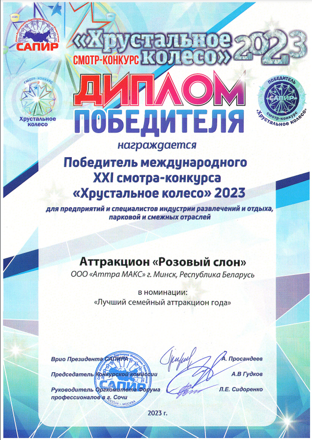 По итогам международного XXI смотр-конкурса «Хрустальное колесо 2023» аттракцион «Розовый слон» становится победителем в номинации «Лучший семейный аттракцион года».